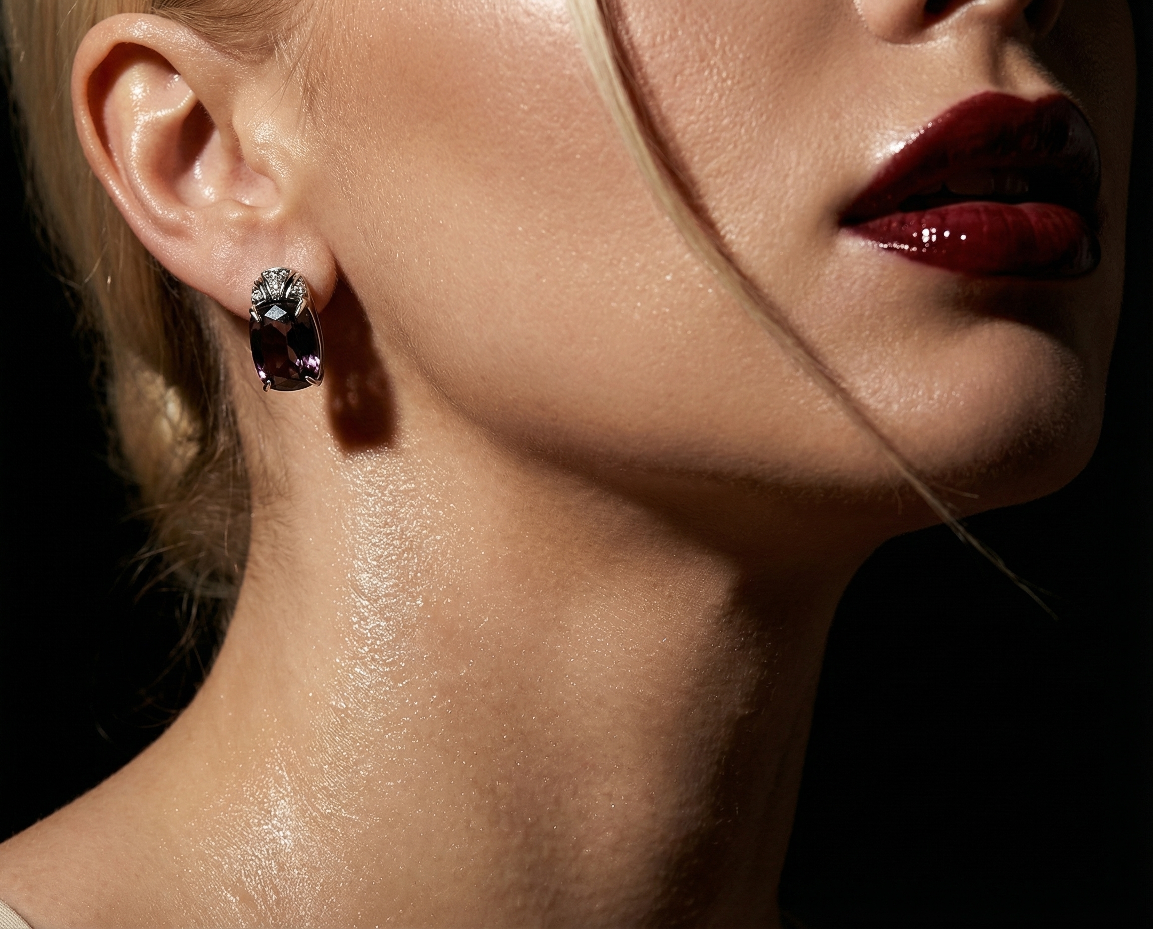 - Вечерний драматизм. Сочетайте их с глубоким винным, изумрудным или классическим черным. Глубина камня подчеркнет вечерний макияж, особенно если добавить немного сатиновых теней в тон кристалла.