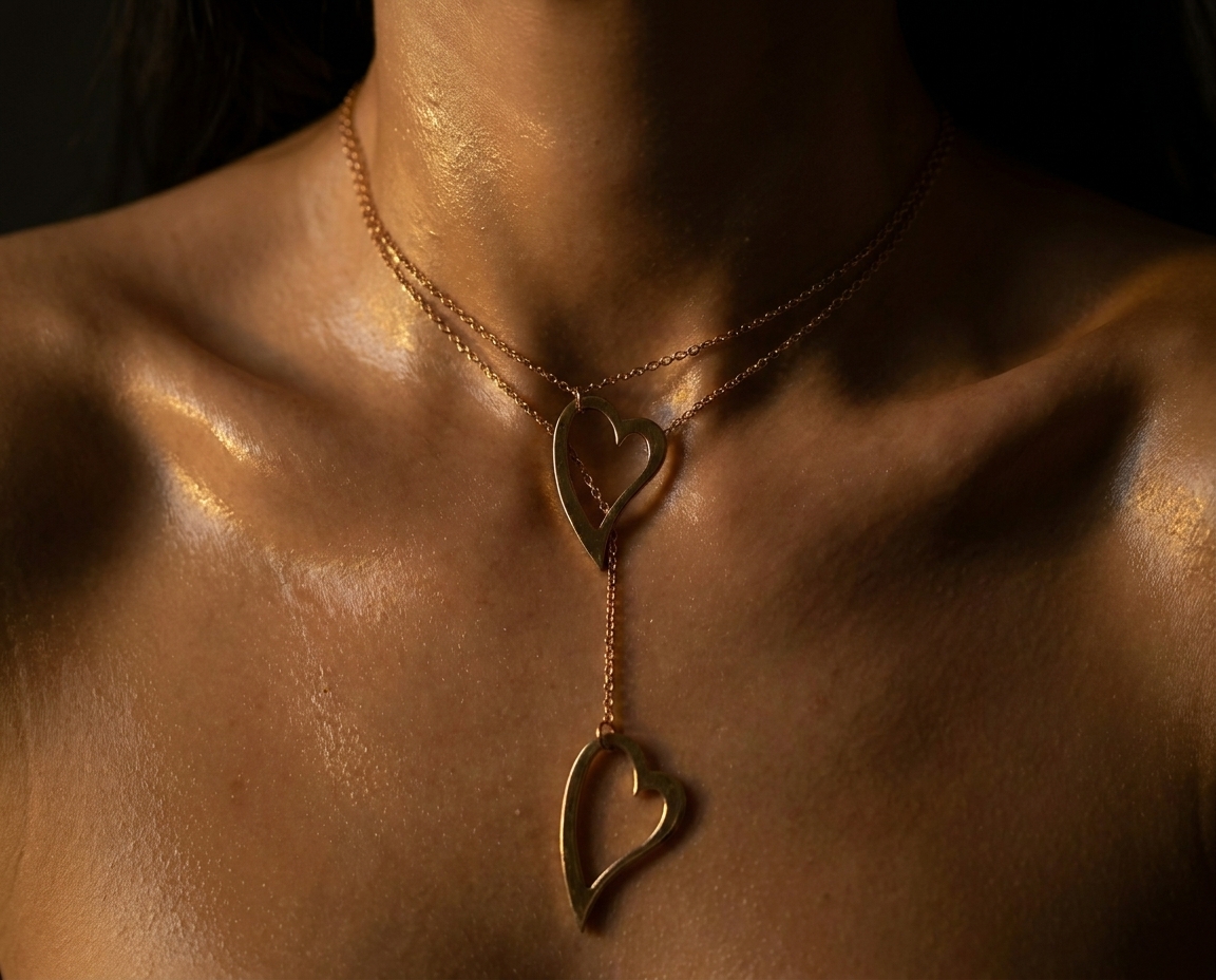 - Драматичная асимметрия: Сердца расположены на разных уровнях, что создает визуальную динамику. Это притягивает взгляд к линии декольте и ключицам, делая образ более хрупким и манящим.