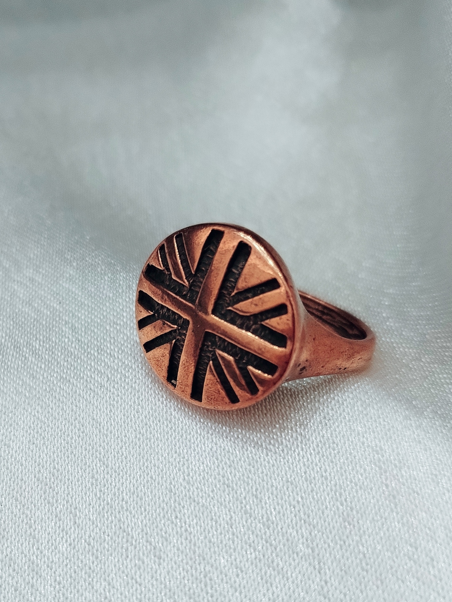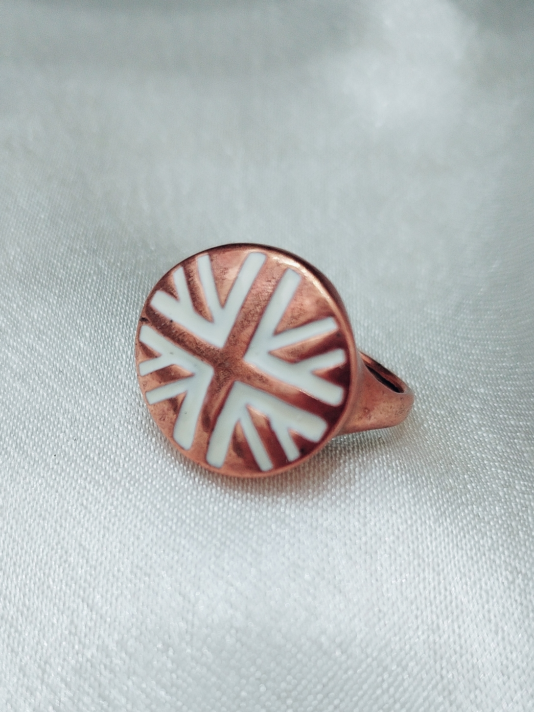 Яркое кольцо с декоративными элементами подчеркнутыми эмалью в геометрическом дизайне, придадут вашему стилю неповторимый лоск и шарм.