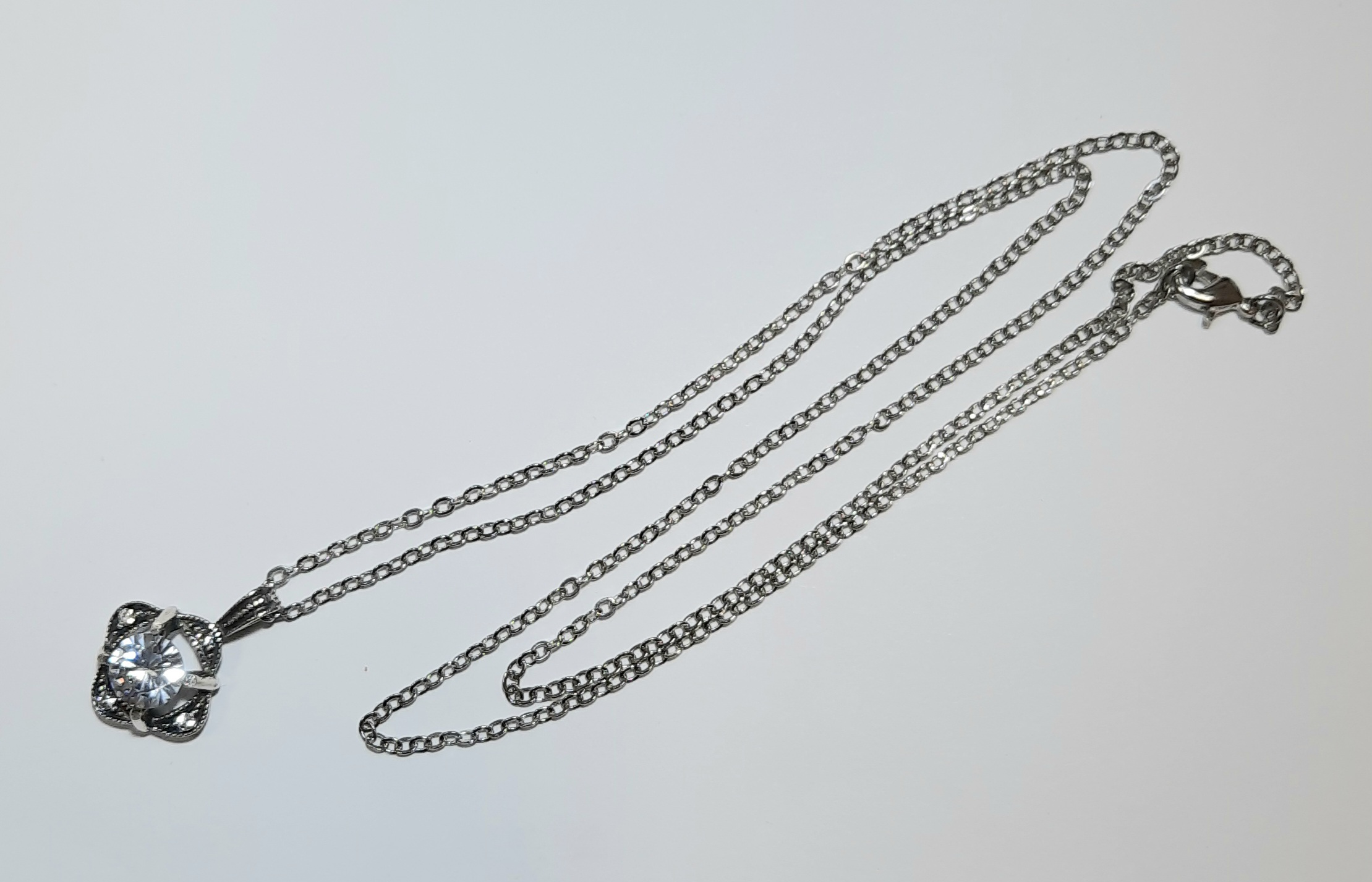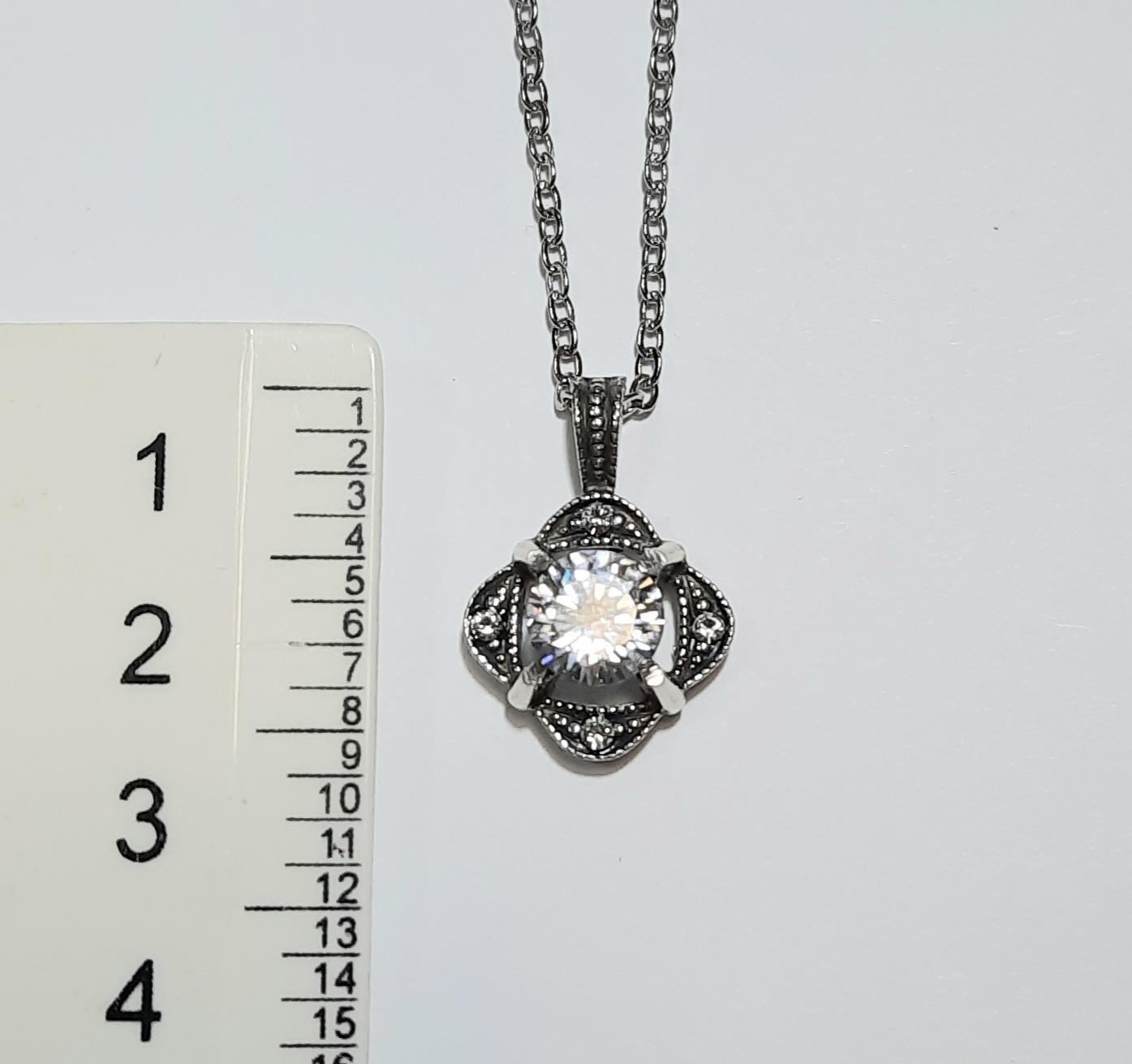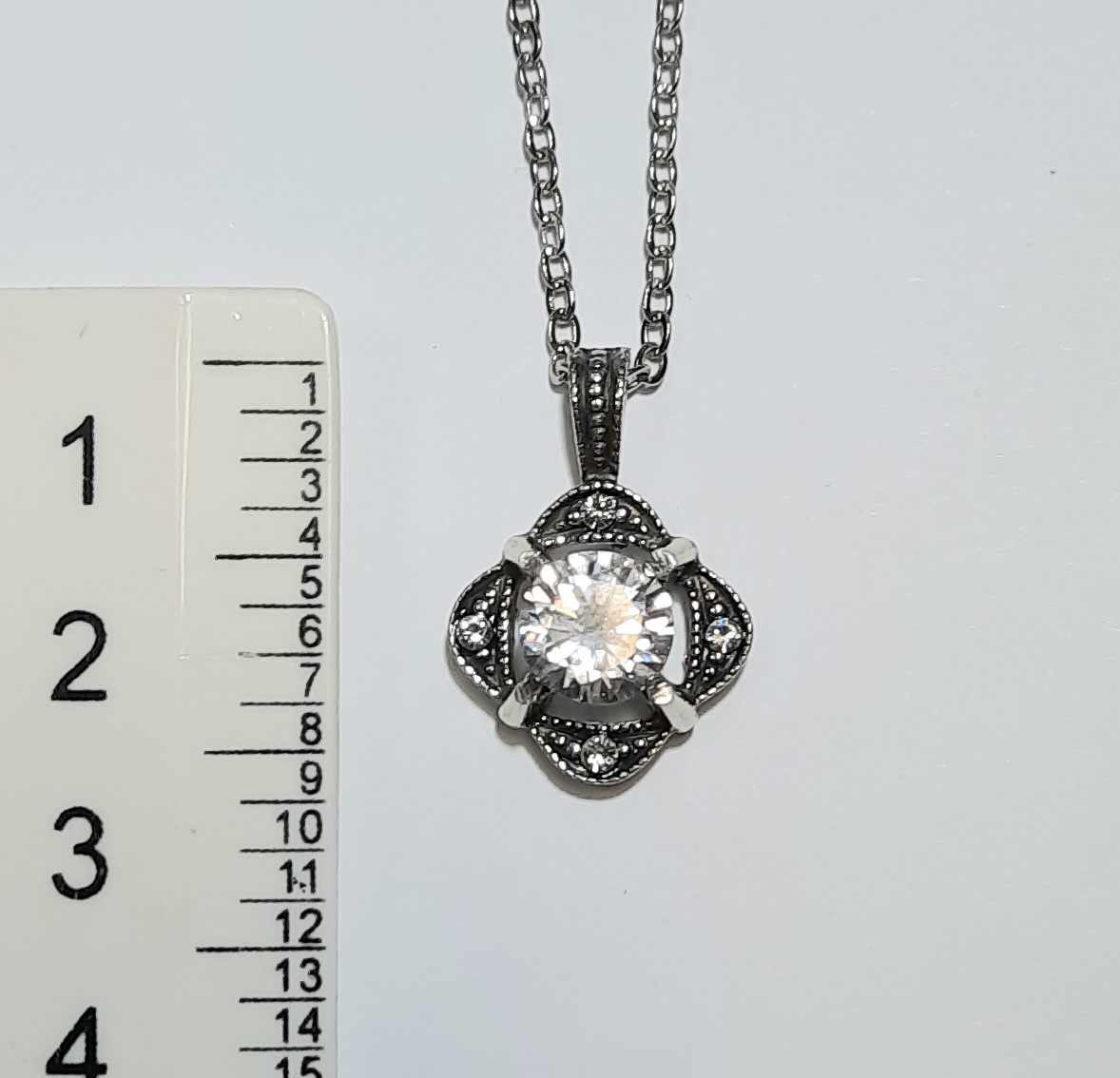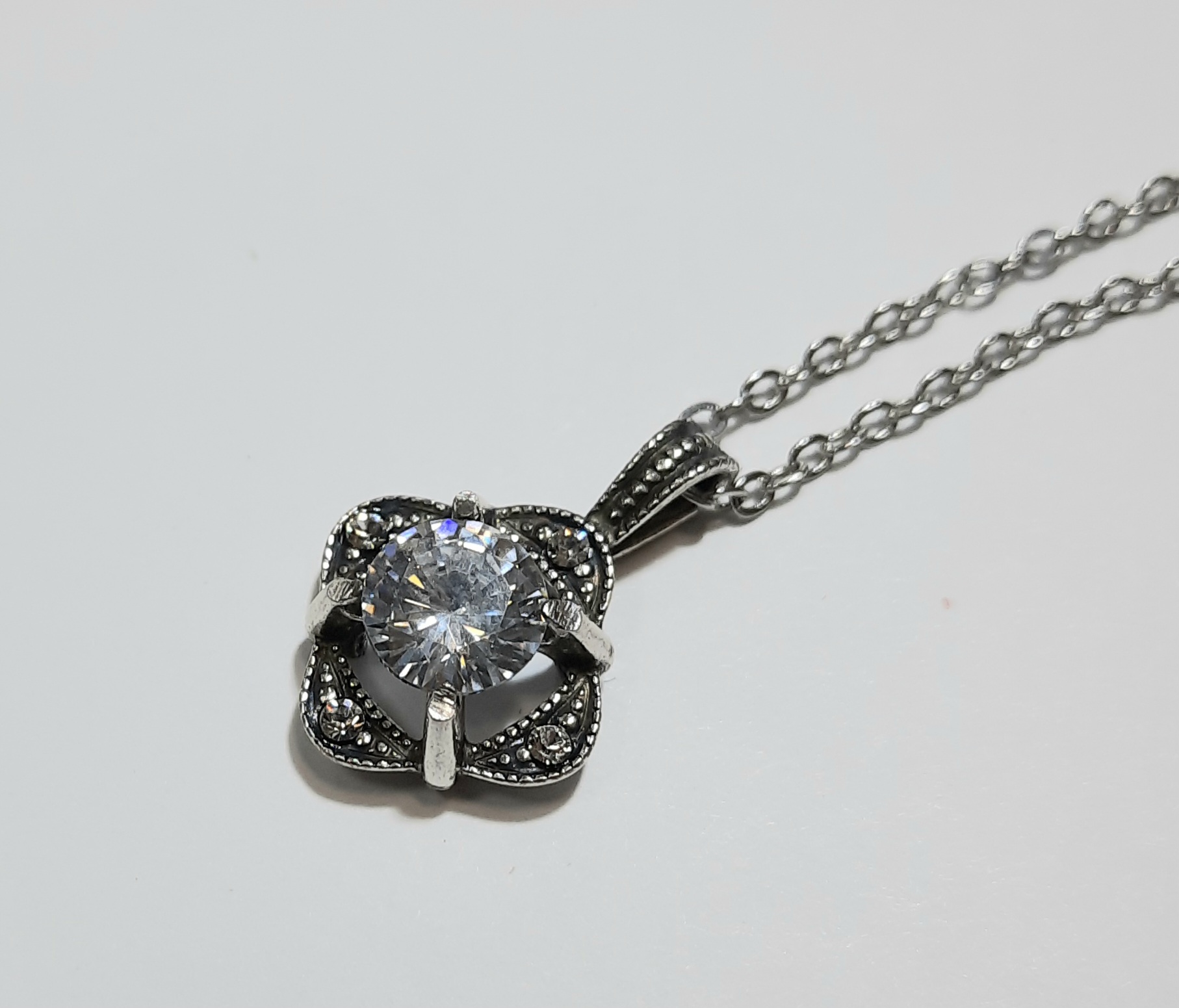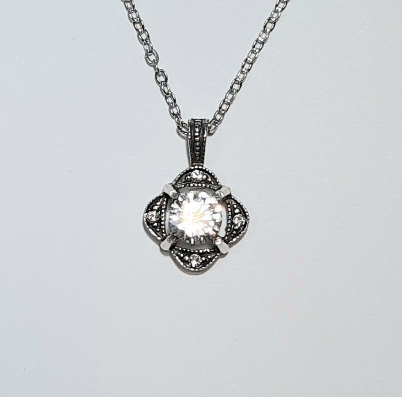 Украшение выполнено в стиле неовинтаж или ар-деко. Чернение серебра в покрытии придает металлу благородный антикварный вид, на фоне которого центральный крупный кристалл сверкает особенно ярко. Рельефный узор с мелкими вставками по краям создает эффект кружева из металла.